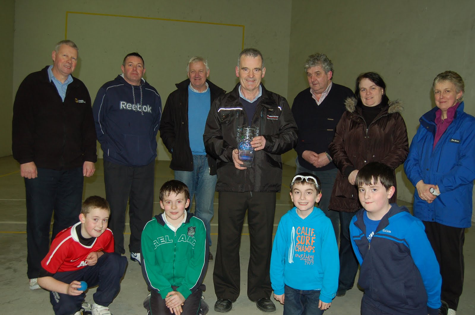 McCann holder of 17 All-Ireland titles in an outstanding sporting career was completely caught off guard as he walked into the Ballymote club where he was presented with a piece of Waterford Crystal. McCann won the Golden Masters Singles All-Ireland 60 x 30 singles title in 2011 and Connacht Masters player of the year award. Before the presentation Martin Golden congratulated McCann on his successes last year. McCann was due to receive the club presentation before Christmas but that was hastily cancelled due to the death of Michael Porter a legend in Irish Handball. McCann won 19 Connacht titles & 5 All-Ireland titles with his dear friend & doubles partner Michael Porter. Golden on behalf of the club sympathised with the Porter family on their sad loss.